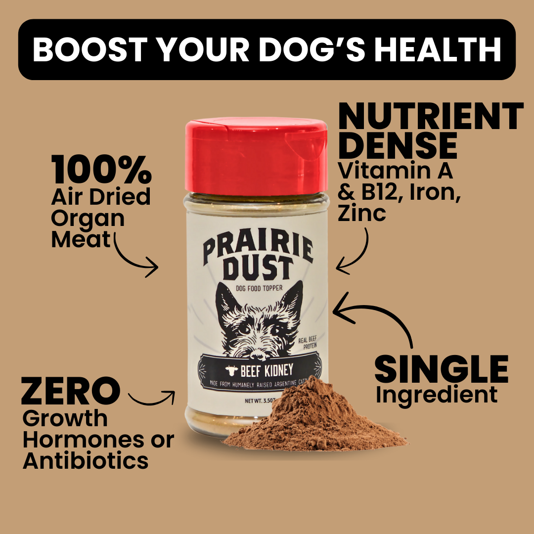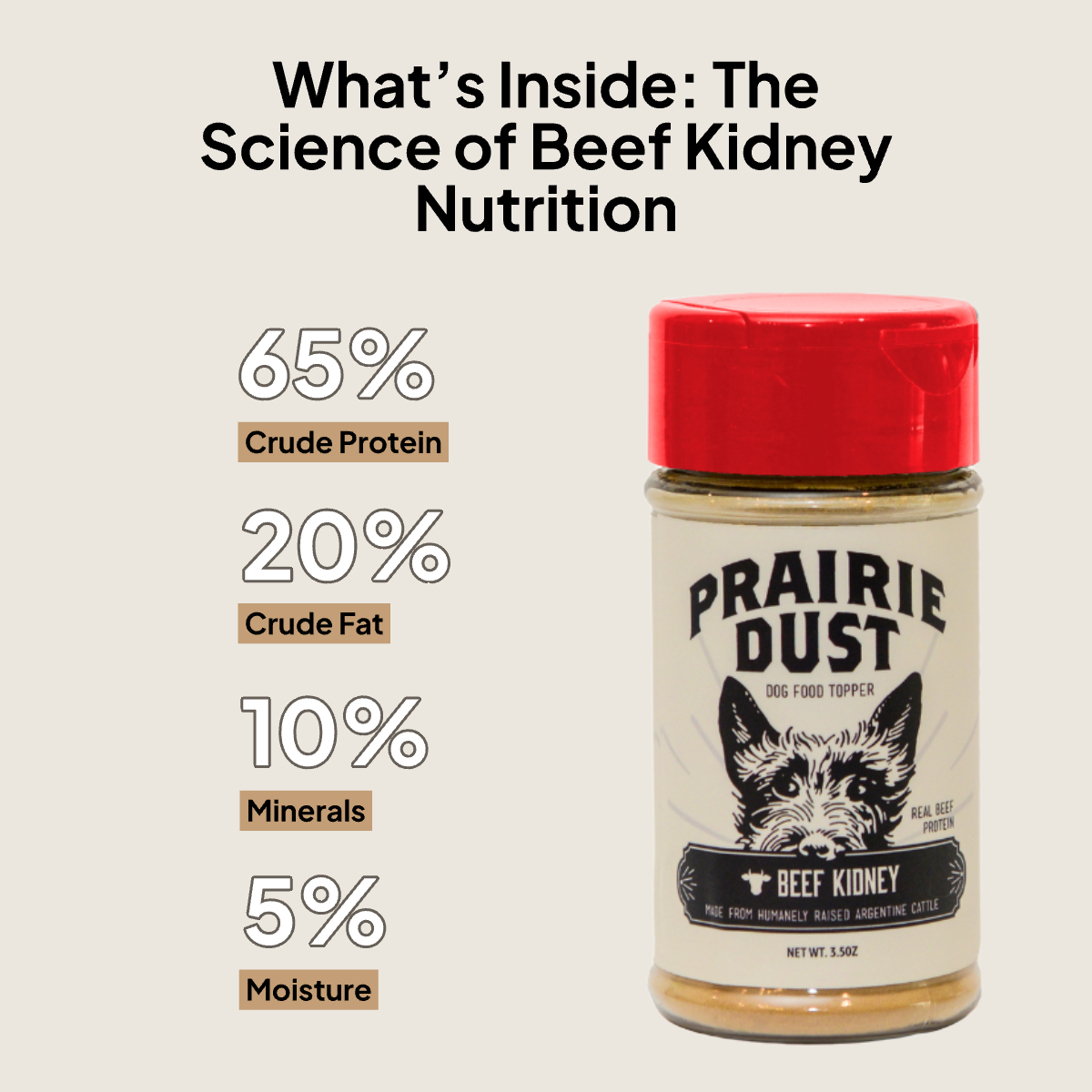 Beef kidney is one of the most nutrient-packed foods available, and Prairie Dust brings its full benefits to your dog. With approximately 65% protein and 20% fat, beef kidney supports lean muscle growth and sustained energy. It’s also rich in essential vitamins like B12 and riboflavin, as well as minerals like selenium and phosphorus, which boost immunity, metabolism, and bone health. Every sprinkle delivers the clean, natural nutrition your dog needs to thrive.