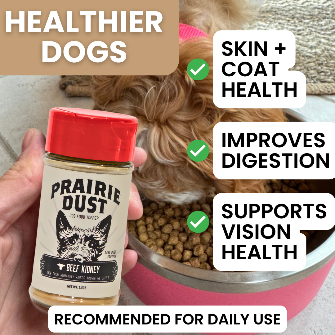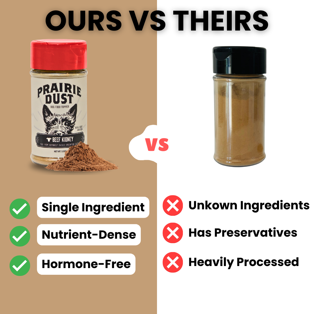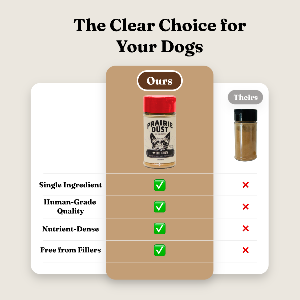 Not all toppers are created equal. Prairie Dust stands out with its 100% single-ingredient formula, free from fillers and packed with essential nutrients your dog needs to thrive. When you choose Prairie Dust, you’re choosing better health, better nutrition, and a happier, healthier dog.
